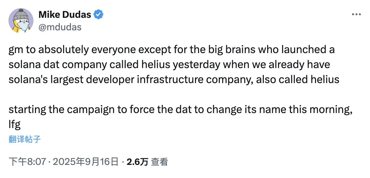 昨日晚间,The Block 联合创始人、6 MV 创始人 Mike Dudas 于 X 公开喊话,呼吁 Solana 社区一起迫使财库公司 Helius 改名 —— “GM,除了那些自作聪明的家伙。他们昨天成立了叫作 Helius 的 SOL 财库公司,殊不知 Solana 最大的基础设施开发公司早就叫这个名字了。今天早上,我将正式启动强制这家 DAT 改名的行动,大家一起冲!“