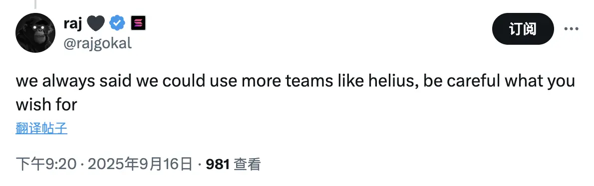 在 Mike Dudas 的下方,包括 Compound 创始人 Robert Leshner 在内的多方人士均表达了支持态度,但最有意思的表态则来自于 Solana 联合创始人 raj(Raj Gokal)——“我们总说希望看到更多像 Helius 这样的团队,看来以后不能瞎许愿了……”