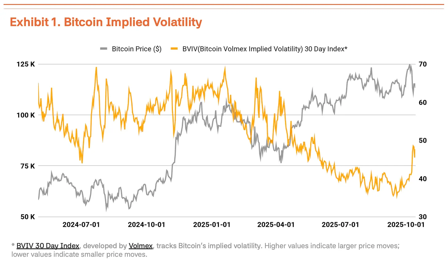 10月6日,比特币创下126,210美元的历史新高,但特朗普政府再次对中国施加贸易压力,导致比特币价格回调 18%至104,000 美元,波动性显著增强。根据Volmex Finance的比特币波动率指数(BVIV),随着机构投资者稳步增持,比特币波动率从3月到9月有所收窄,但在9月之后飙升41%,加剧了市场的不确定性(图表1)。