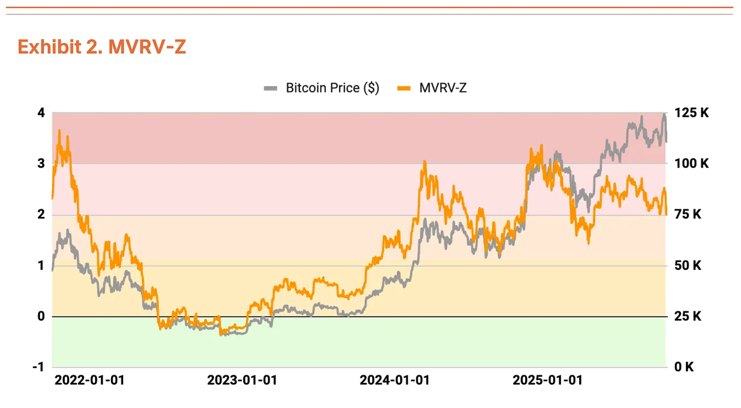 链上分析揭示了一些过热迹象,不过估值尚不令人担忧。MVRV-Z 指标(市值与已实现价值之比)目前处于过热区域,为 2.31,但相对于 7-8 月接近的极端估值区间,已趋于稳定(图表2)。