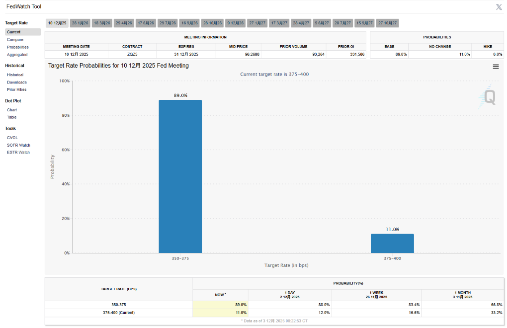 市场迅速做出反应,芝商所“美联储观察”工具显示,市场押注美联储12月降息的概率已从一周前的约86%飙升至近89%。