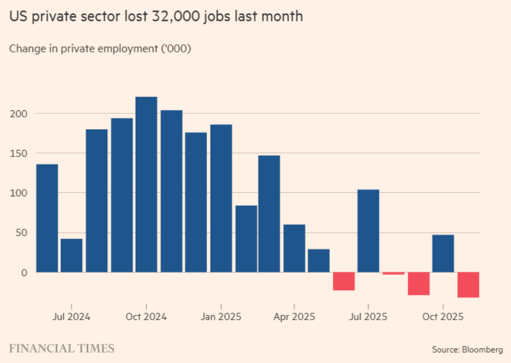 东八区时间12月3日晚公布的美国ADP就业数据显示,美国私营部门11月减少3.2万个工作岗位,远低于市场预期的增加1万个,创下自2023年3月以来最大降幅。