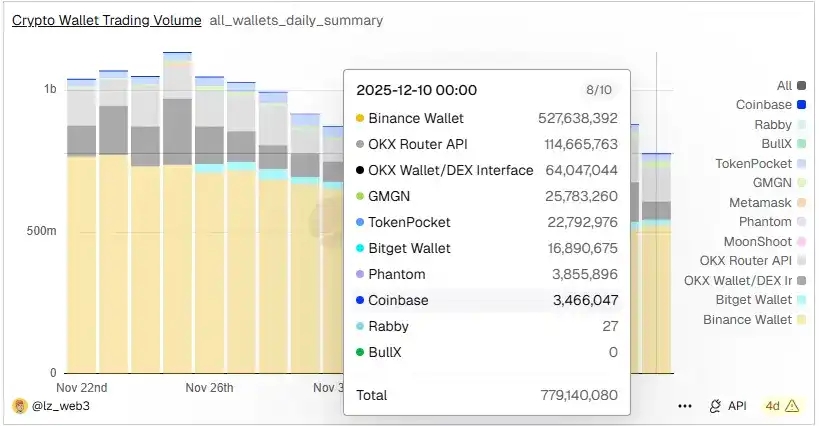 然而,交易量端的隐忧同样突出。根据 Dune Analytics 数据,Phantom 在全网嵌入式 swap 市场的份额从年初接近 10%,5 月跌至 2.3%,年底进一步缩到只有 0.5%。而交易平台系钱包凭借费率优势、上新速度及高额空投补贴,吸引了大量高频交易用户,目前 Binance Wallet 占据近七成,OKX(钱包+路由 API)加起来超两成。