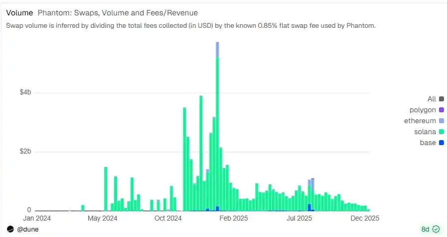 2025 年对 Phantom 来说是冰火两重天:一边是用户和产品层面的快速突破,一边是交易量份额被交易平台系钱包大幅蚕食。